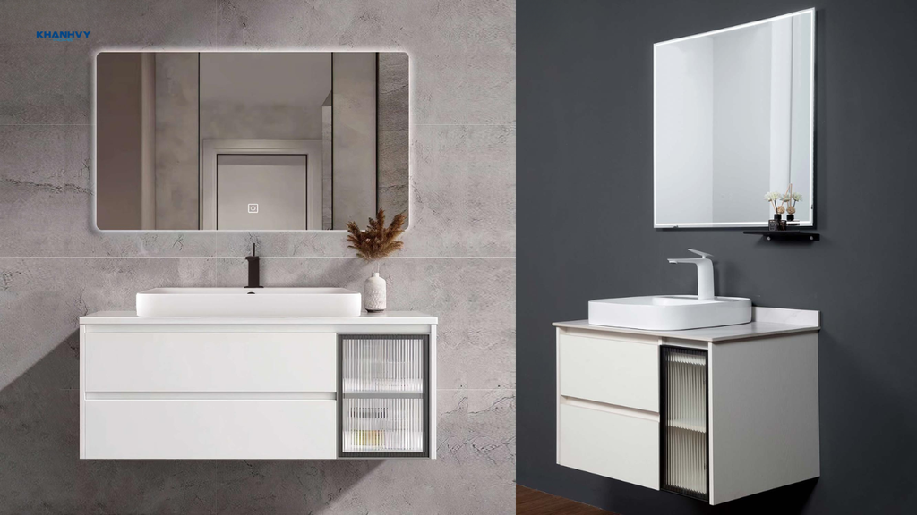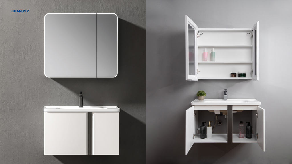 Phần gương thường được tích hợp vào trên cánh tủ hoặc đặt ở bên cạnh tủ, phần tủ được bố trí hệ thống giá kệ nhỏ để đựng đồ dùng cá nhân. Nhờ đó, người dùng vừa có thể soi gương, vừa dễ dàng lấy các vật dụng cần thiết, đồng thời vẫn giữ được sự gọn gàng và hiện đại cho phòng tắm.