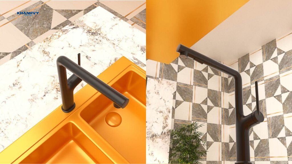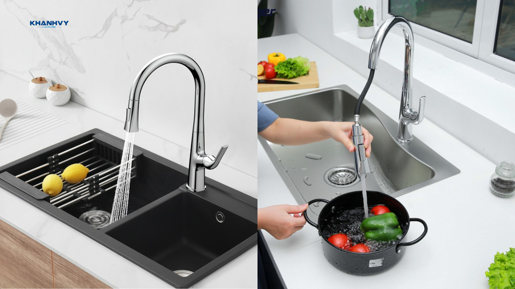 Kiểu dáng | Vòi ngỗng cứng, cổ thấp hoặc trung. | Vòi chữ L/vòi rút dây, cổ cao, thẩm mỹ hiện đại. |