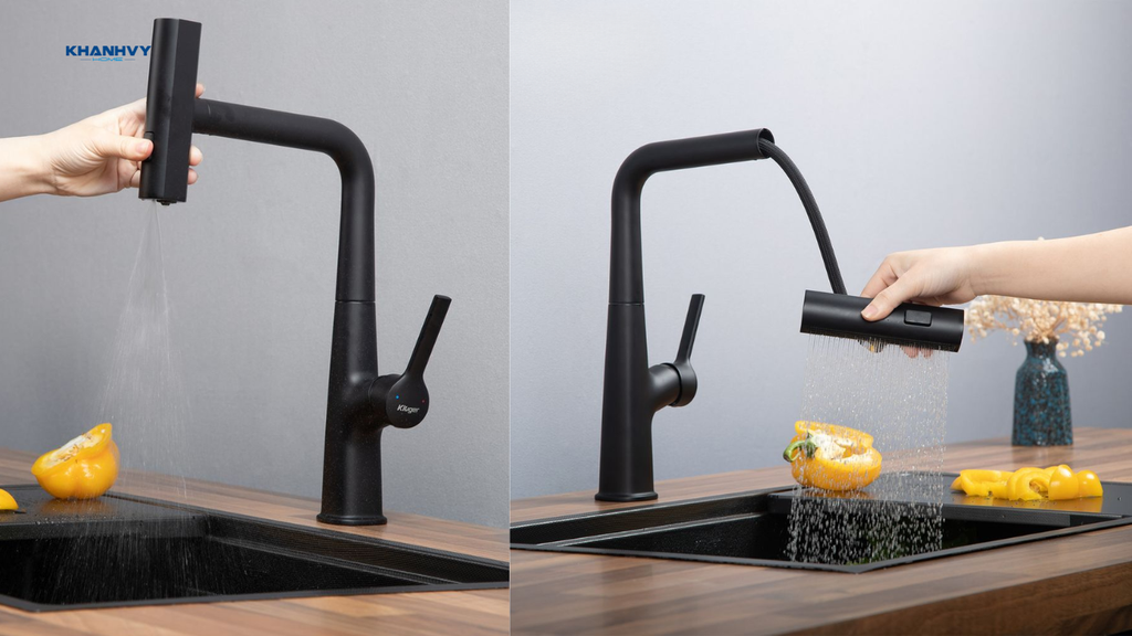 Vòi rửa bát dây rút Kluger Amber KLF0001B là sự kết hợp hoàn hảo giữa thiết kế tinh tế và hiệu năng vượt trội, mang đến vẻ đẹp sang trọng, hiện đại cho mọi không gian bếp. Sản phẩm được trang bị đầu phun kéo xuống linh hoạt (Pull-down) cùng đầu phun chức năng kép xoay 360°, cho phép người dùng dễ dàng điều chỉnh hướng nước và chế độ phun tùy theo nhu cầu, từ rửa rau củ, chén đĩa đến vệ sinh bồn rửa.