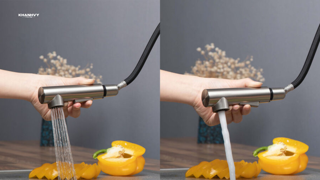 Thiết kế đầu vòi thẳng hiện đại, tay điều khiển công thái học, cùng khả năng xoay 360 độ linh hoạt và dây rút tiện dụng giúp thao tác dễ dàng hơn trong mọi góc rửa, mang lại trải nghiệm sử dụng tiện nghi và thoải mái.