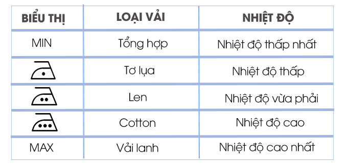 - Chế độ ủi khô: Vặn nút điều chỉnh hơi nước về vị trí 0 (tức là không sử dụng hơi nước) và chỉnh nhiệt độ từng loại vải.