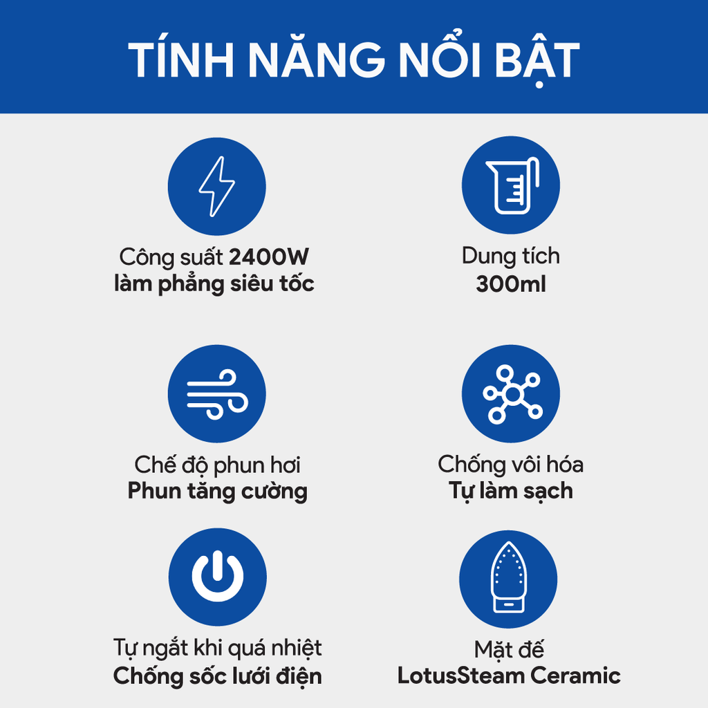 - Công suất mạnh 2.400W làm nóng nhanh, ủi mượt mọi chất vải
