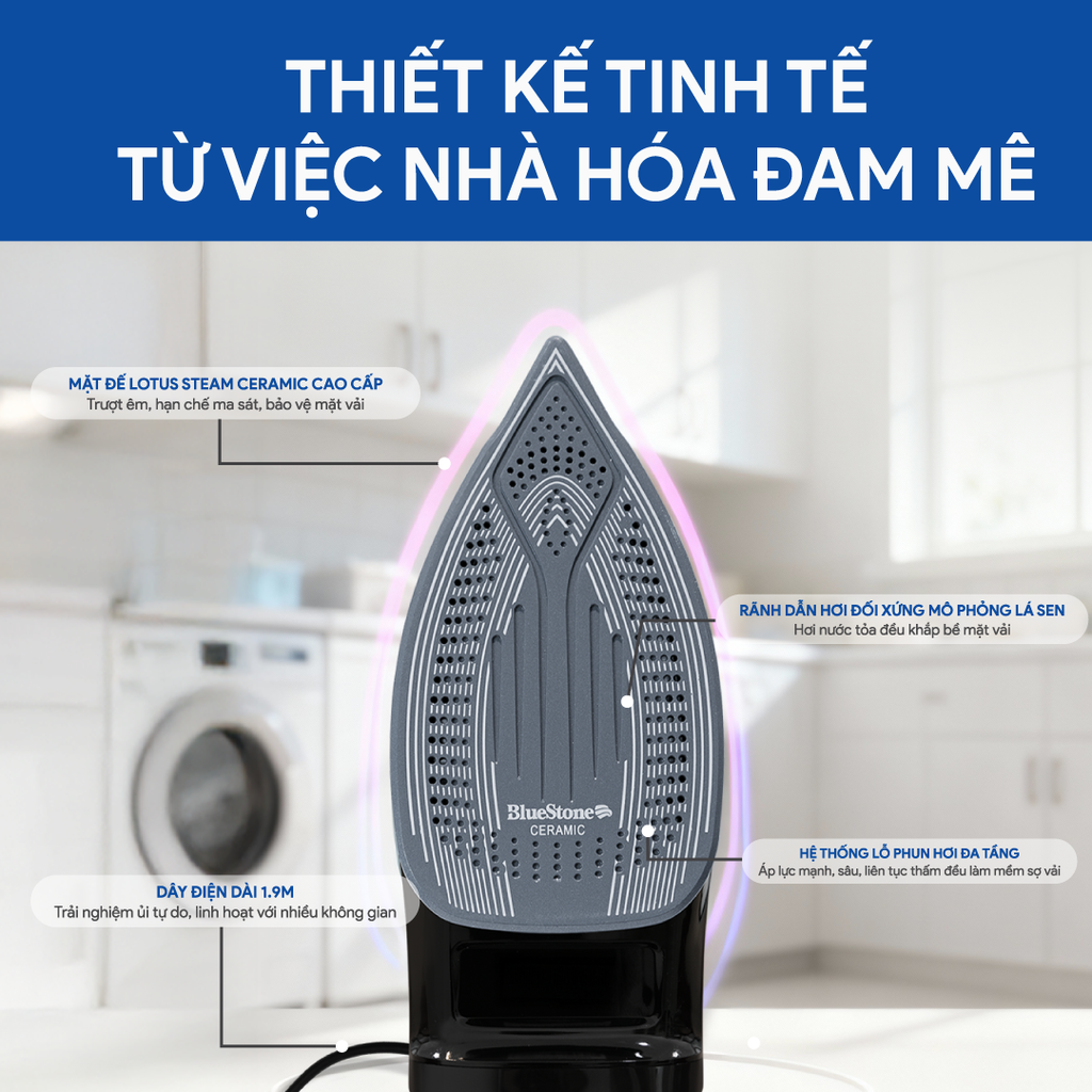 - Mặt đế LotusSteam Ceramic cao cấp, trượt êm, chống dính, bảo vệ bề mặt vải