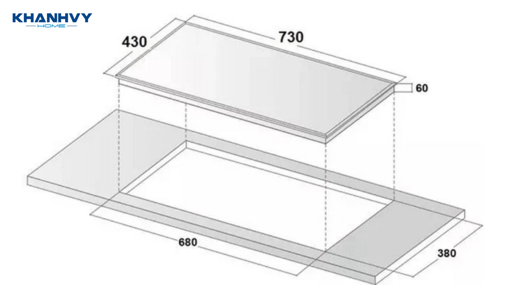 Bước 2: Kích thước khoét đá dành cho bếp âm khoảng 680 mm x 380 mm, mặt bàn có độ dày tối thiểu 20-30 mm. Đặt bếp vào khoang đã khoét.