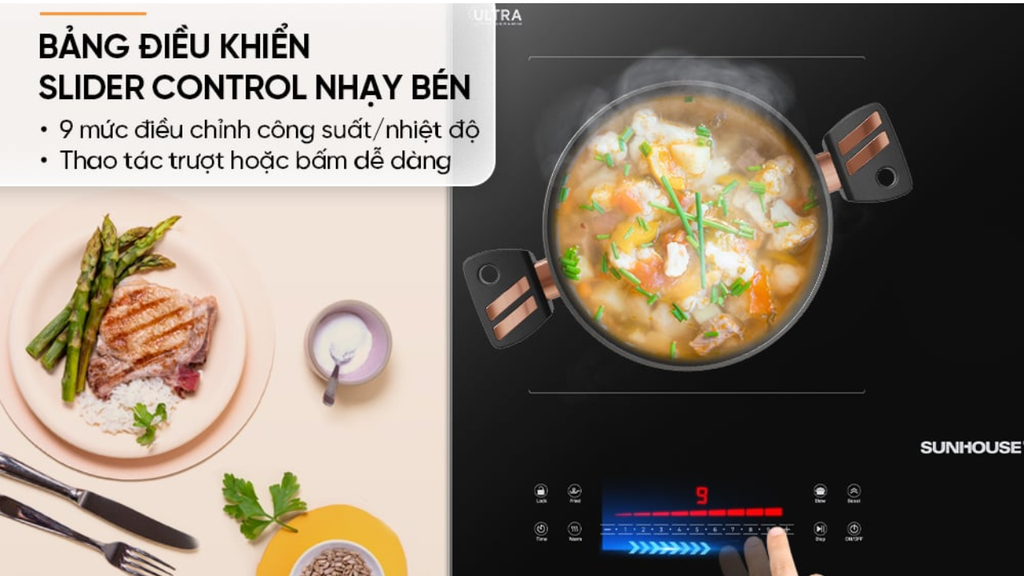 Bếp có 9 mức điều chỉnh nhiệt độ/công suất với 2 bảng điều khiển riêng biệt cho từng vùng nấu. Mặt điều khiển SLIDER CONTROL cảm ứng nhạy bén giúp điều chỉnh nhiệt độ và các chế độ nấu nhanh chóng và thuận tiện chỉ với 1 thao tác.