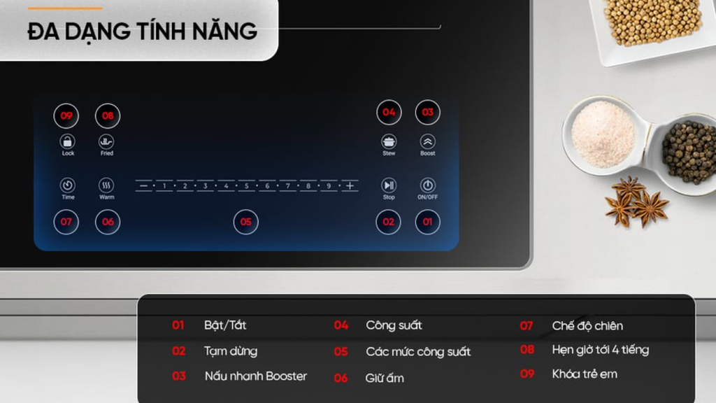 Chế độ tạm dừng: Bạn có thể lựa chọn chức năng tạm dừng trong quá trình nấu khi bạn cần tạm ngưng hoạt động của bếp nhưng vẫn muốn giữ nguyên mức nhiệt độ/chức năng đang sử dụng. Sau đó, bạn chỉ cần nhấn nút tạm dừng một lần nữa để bếp hoạt động lại đúng cài đặt trước đó.