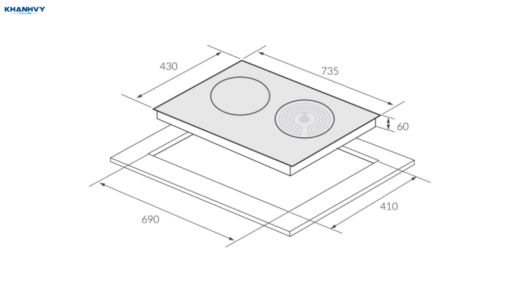 Kích thước bếp: 735mm (R) x 430mm (S) x 60mm (C).