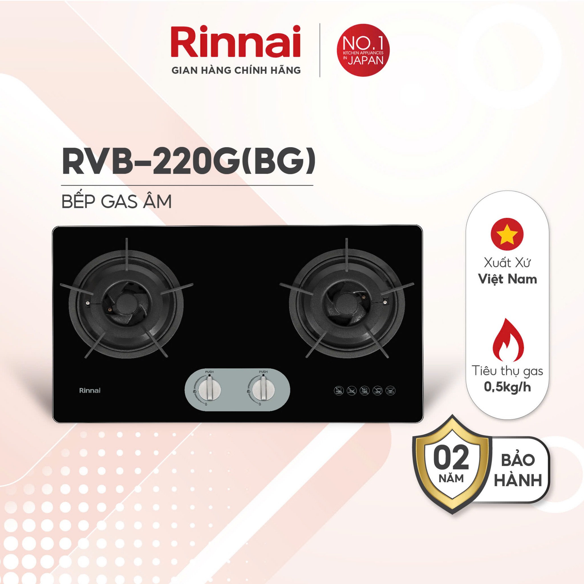 - Bếp ga âm Rinnai RVB-220G(BG) là sản phẩm bếp gas âm chính hãng Rinnai với 02 lò nấu. Mặt kính màu đen sang trọng, chất liệu kính cao cấp chịu lực, chịu nhiệt tốt.