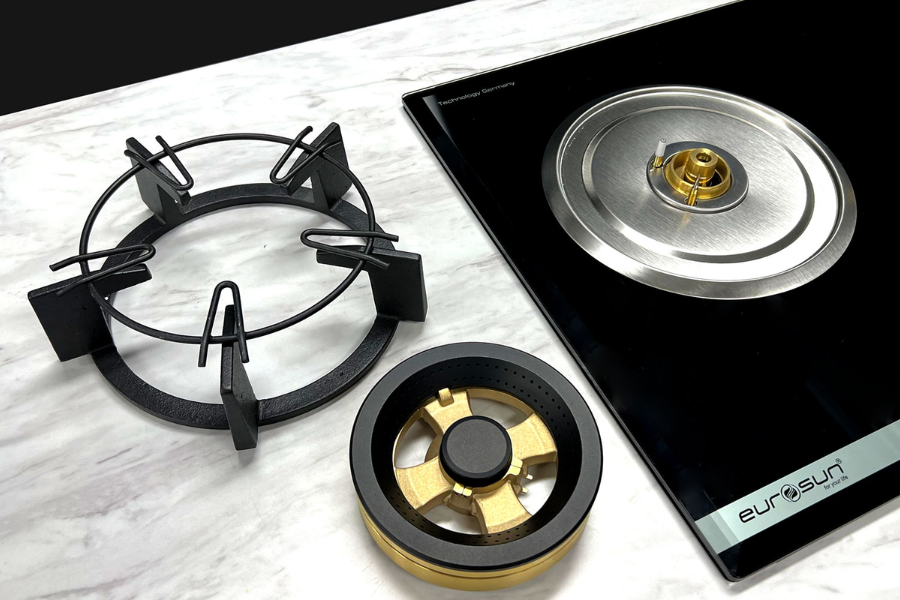 Bếp ga âm Eurosun EU-GA205S có bộ kiềng gang chống trượt, chắc chắn, đảm bảo an toàn trong quá trình đun nối. Bếp ga gia đình được lắp ráp bộ họng được làm từ đồng bền bỉ với thời gian trong môi trường oxy hóa cao, họng bếp được gia công bằng công nghệ cao (tiện CNC) tránh hiện tượng lọt khe lửa. Chân sứ được định vị bằng đồng hạn chế tối đa cho mọi va chạm khi sử dụng cũng như vệ sinh.