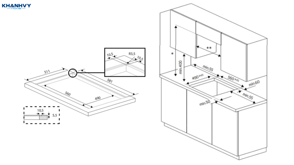 Đảm bảo bề mặt bếp cách tường và tủ trên ít nhất 10–15 cm để thoát nhiệt tốt.