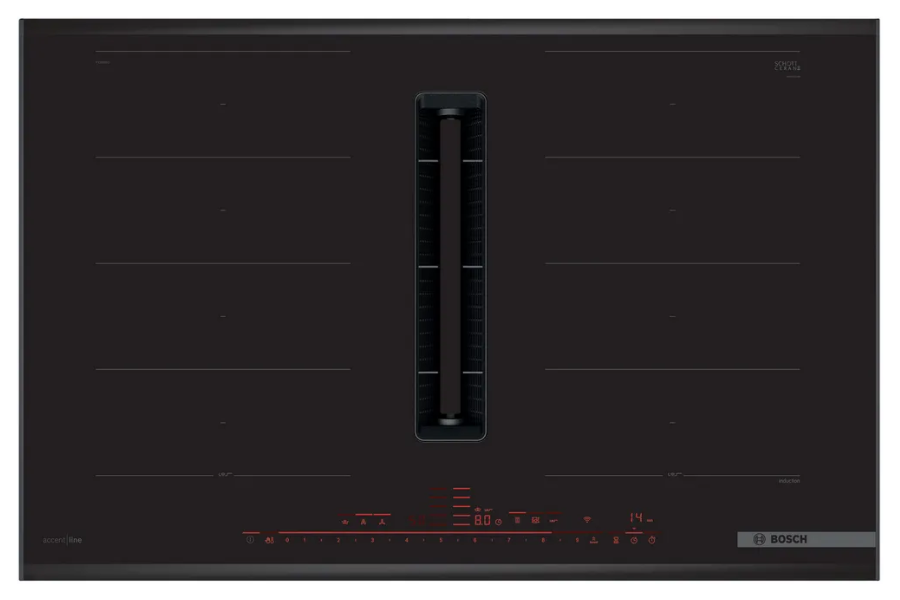 Bosch PXX895D66E sở hữu thiết kế âm bàn đá 80 cm với màu đen sang trọng và khung viền kiểu Accentline, phù hợp với nhiều phong cách bếp hiện đại. Việc kết hợp bếp và hút mùi trong một sản phẩm tạo nên một tổng thể thống nhất, giúp không gian bếp luôn gọn gàng mà vẫn đảm bảo hiệu suất nấu và thông gió tối ưu.