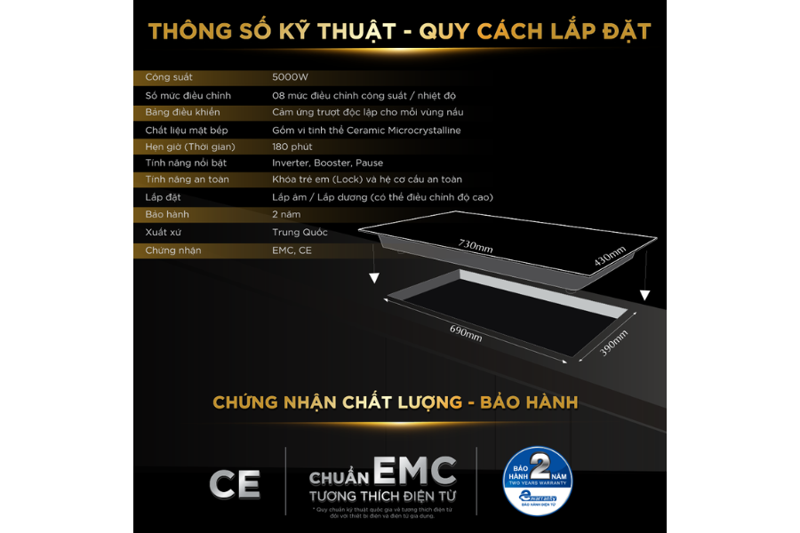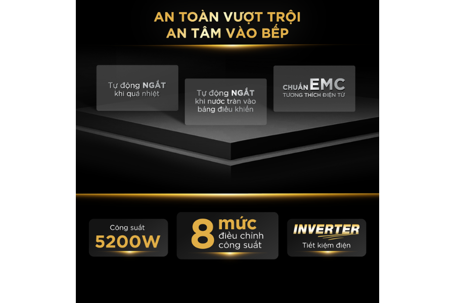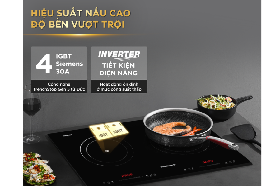 Bên cạnh đó, bếp được ứng dụng công nghệ Inverter tiên tiến, bếp vận hành ổn định, giữ nhiệt đều và giúp tiết kiệm điện năng đáng kể. Công nghệ này không chỉ tối ưu chi phí sử dụng điện hàng tháng mà còn góp phần bảo vệ môi trường, phù hợp với xu hướng sống xanh hiện đại.