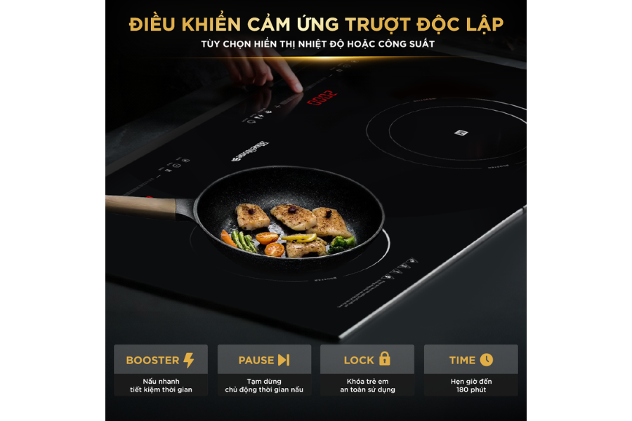 Bếp từ đôi BlueStone ICB-6825 trang bị bảng điều khiển cảm ứng trượt độc lập cho từng vùng nấu, kết hợp màn hình LED hiển thị rõ ràng. Người dùng chỉ cần thao tác nhẹ nhàng để điều chỉnh công suất hoặc chế độ nấu, mang đến trải nghiệm nấu ăn đơn giản mà đầy hiện đại. Ngoài ra, bếp đa tiện ích với chức năng Nấu nhanh (Booster) giúp rút ngắn tối đa thời gian nấu, trong khi tính năng Tạm dừng (Pause) mang lại sự linh hoạt cho người nội trợ bận rộn.
