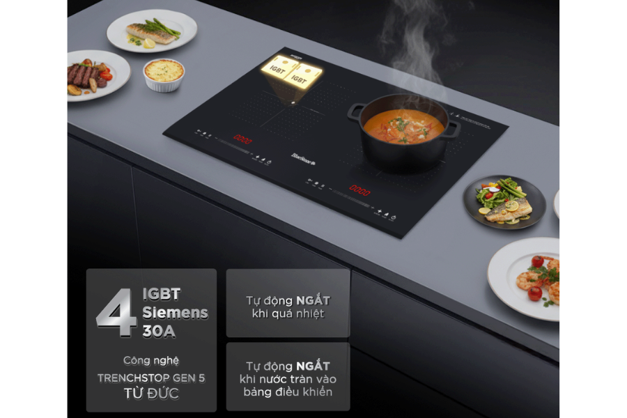 Bếp được tích hợp 4 IGBT Siemens 30A công nghệ TrenchStop™ Gen 5 đến từ Đức, cho khả năng hoạt động mạnh mẽ, ổn định và đạt hiệu suất tối ưu. Công nghệ tiên tiến này giúp bảo vệ linh kiện bên trong, hạn chế rủi ro hỏng hóc và tăng tuổi thọ sản phẩm, khẳng định chất lượng khác biệt của BlueStone.