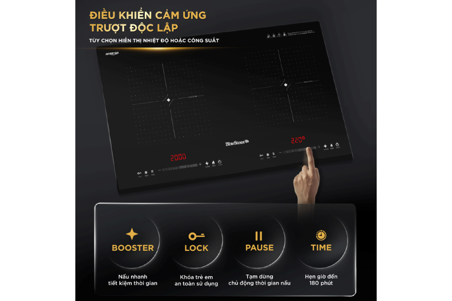 BlueStone ICB-6939 trang bị bảng điều khiển cảm ứng trượt độc lập cho từng vùng nấu, kết hợp màn hình LED hiển thị rõ ràng. Người dùng chỉ cần thao tác nhẹ nhàng để điều chỉnh công suất hoặc chế độ nấu, mang đến trải nghiệm nấu ăn đơn giản mà đầy hiện đại.