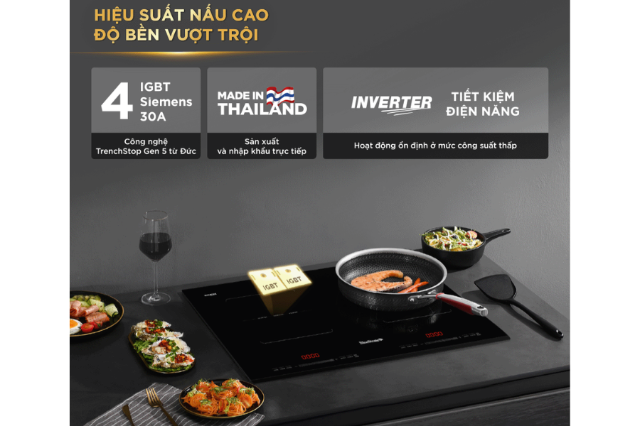 Điểm khác biệt nổi bật của BlueStone ICB-6949 chính là được trang bị 4 IGBT Siemens 30A công nghệ TrenchStop™ Gen 5 (Đức). Linh kiện cao cấp này giúp bếp đạt hiệu suất tối ưu, vận hành bền bỉ và ổn định trong suốt quá trình nấu nướng. Đồng thời, công nghệ tiên tiến từ Đức còn giúp bảo vệ linh kiện bên trong, giảm thiểu hư hại, từ đó tăng tuổi thọ sản phẩm vượt trội so với nhiều dòng bếp thông thường.