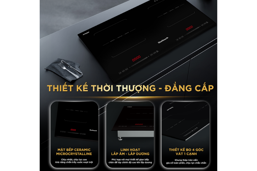 Với thiết kế tinh tế bo 4 góc, vát 1 cạnh cùng khung thép mặt dưới chắc chắn, tạo được tính ổn định, bền vững khi lắp đặt và sử dụng. Đặc biệt bếp được thiết kế hiện đại với 2 kiểu lắp đặt: lắp âm sang trọng hoặc lắp dương tiện dụng. Trong trường hợp lắp dương, chân đế của bếp có thể điều chỉnh độ cao linh hoạt, phù hợp với nhiều không gian bếp khác nhau. Thiết kế này mang đến sự linh hoạt tối đa, giúp sản phẩm trở thành lựa chọn lý tưởng cho cả căn bếp mới xây dựng lẫn bếp cần cải tạo.