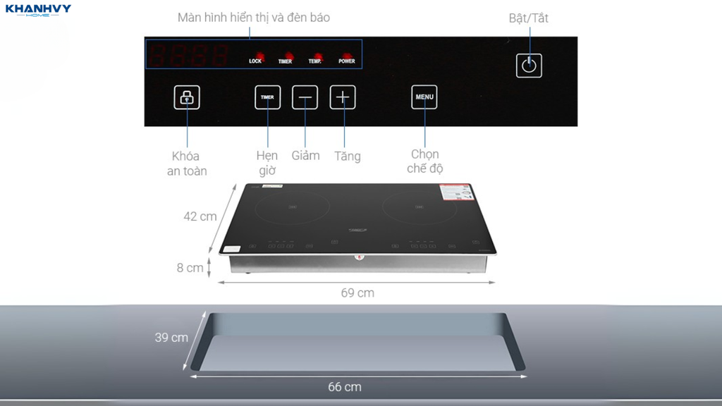 Bảng điều khiển hoạt động độc lập cho từng vùng nấu, giúp điều chỉnh công suất/nhiệt độ linh hoạt theo nhu cầu từng món ăn.