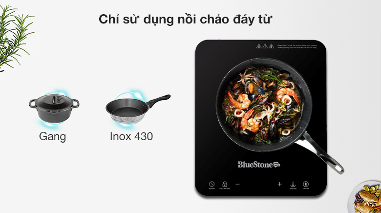 Chỉ sử dụng với nồi/chảo có đáy nhiễm từ chất liệu gang, inox 430 với đường kính đáy từ 12 - 26 cm