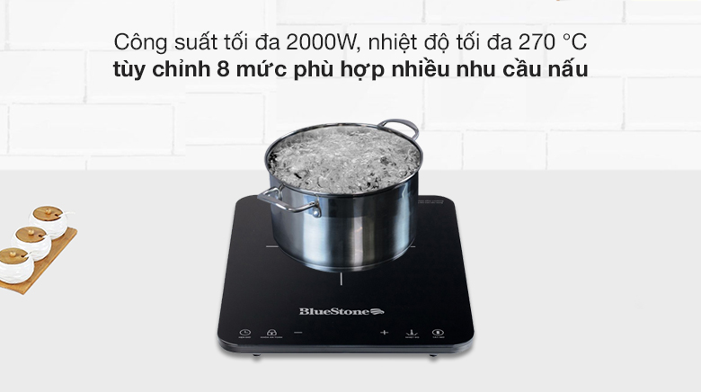 Bếp từ BlueStone có công suất tối đa 2000W, nhiệt độ tối đa 270°C, có thể tùy chỉnh 8 mức:
