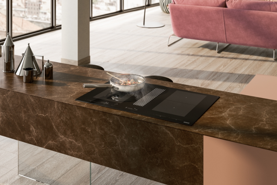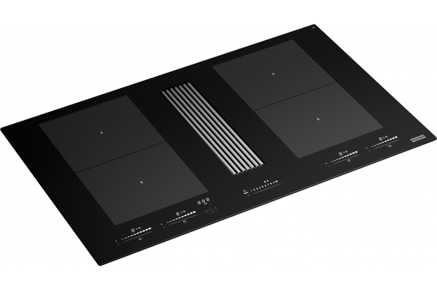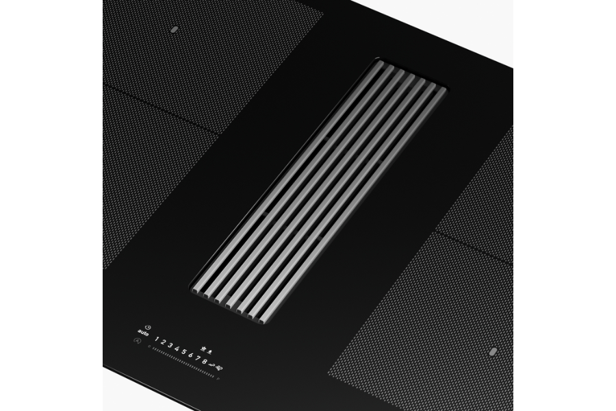 Sản phẩm sở hữu thiết kế âm bàn liền mạch, mặt kính đen tinh tế tạo cảm giác hiện đại và cao cấp cho không gian bếp. Hệ thống hút mùi được đặt ngay giữa bếp, giúp loại bỏ mùi và khói ngay khi phát sinh mà không cần lắp đặt máy hút mùi treo tường truyền thống, đặc biệt phù hợp với bếp đảo và bếp mở.