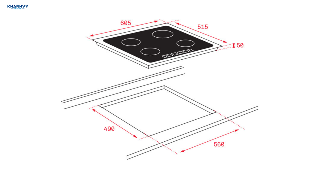 Xác định vị trí đặt bếp mong muốn, đảm bảo vị trí này đủ với kích thước của bếp 605 x 515 mm. Vị trí này nên gần nguồn điện để thuận tiện lắp đặt và sử dụng.
