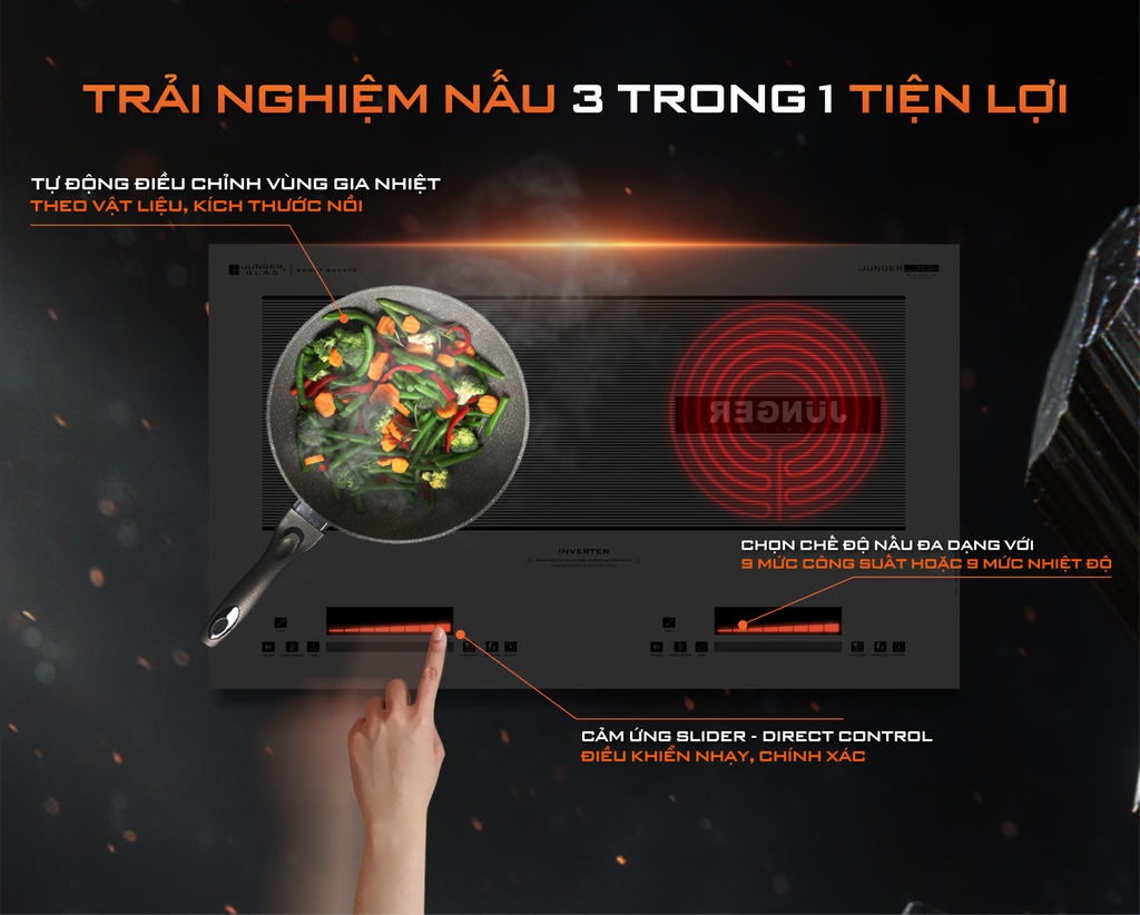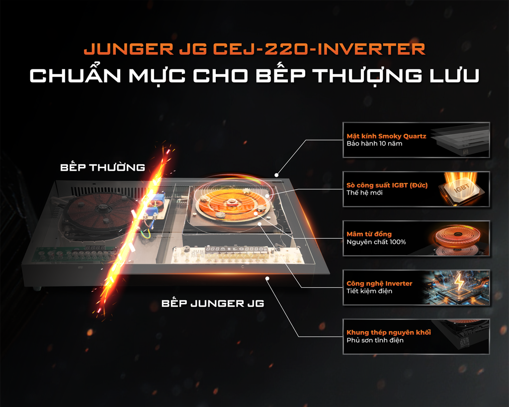 Công nghệ Inverter trên bếp từ Junger JG CEJ-221-INVERTER không chỉ giúp tiết kiệm điện mà còn đảm bảo gia nhiệt ổn định và chính xác.