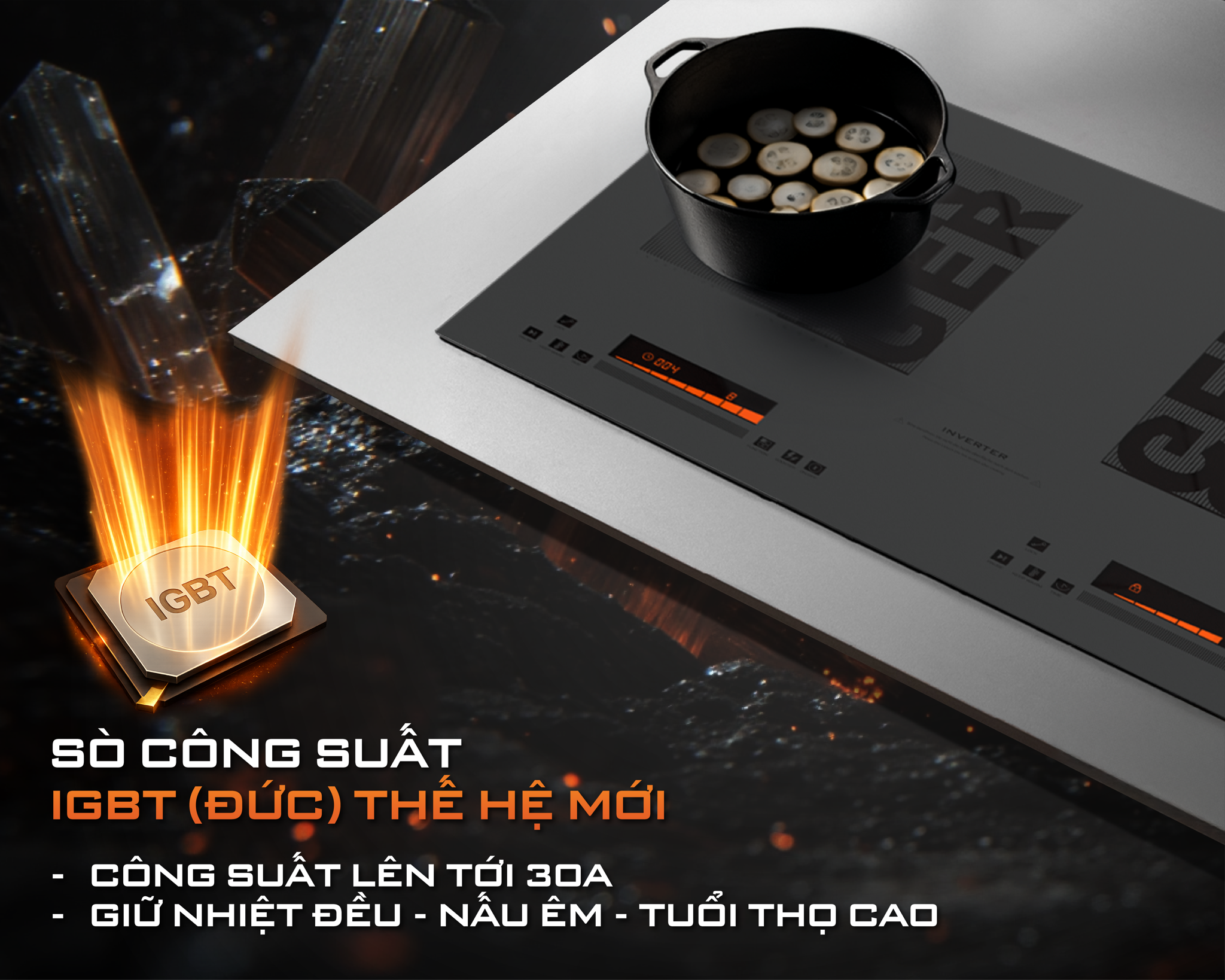 Bốn sò IGBT công suất lớn giúp kiểm soát nhiệt ổn định, bếp vận hành êm và bền