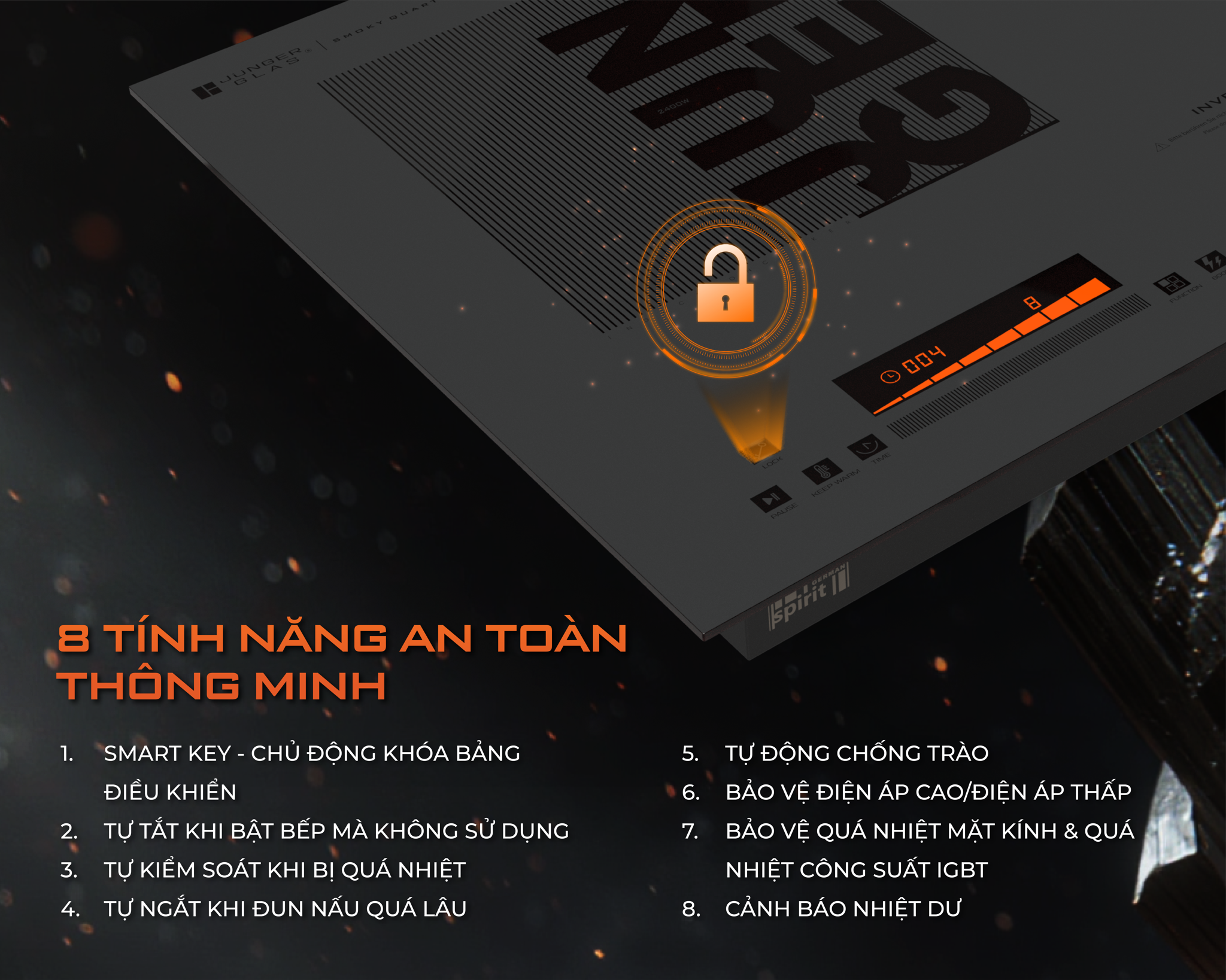 - Bảo vệ quá nhiệt mặt kính và quá nhiệt công suất IGBT: Sensor phát hiện nhiệt độ bất thường tại mặt kính hoặc mạch công suất, bếp tự ngắt và cảnh báo kịp thời.
