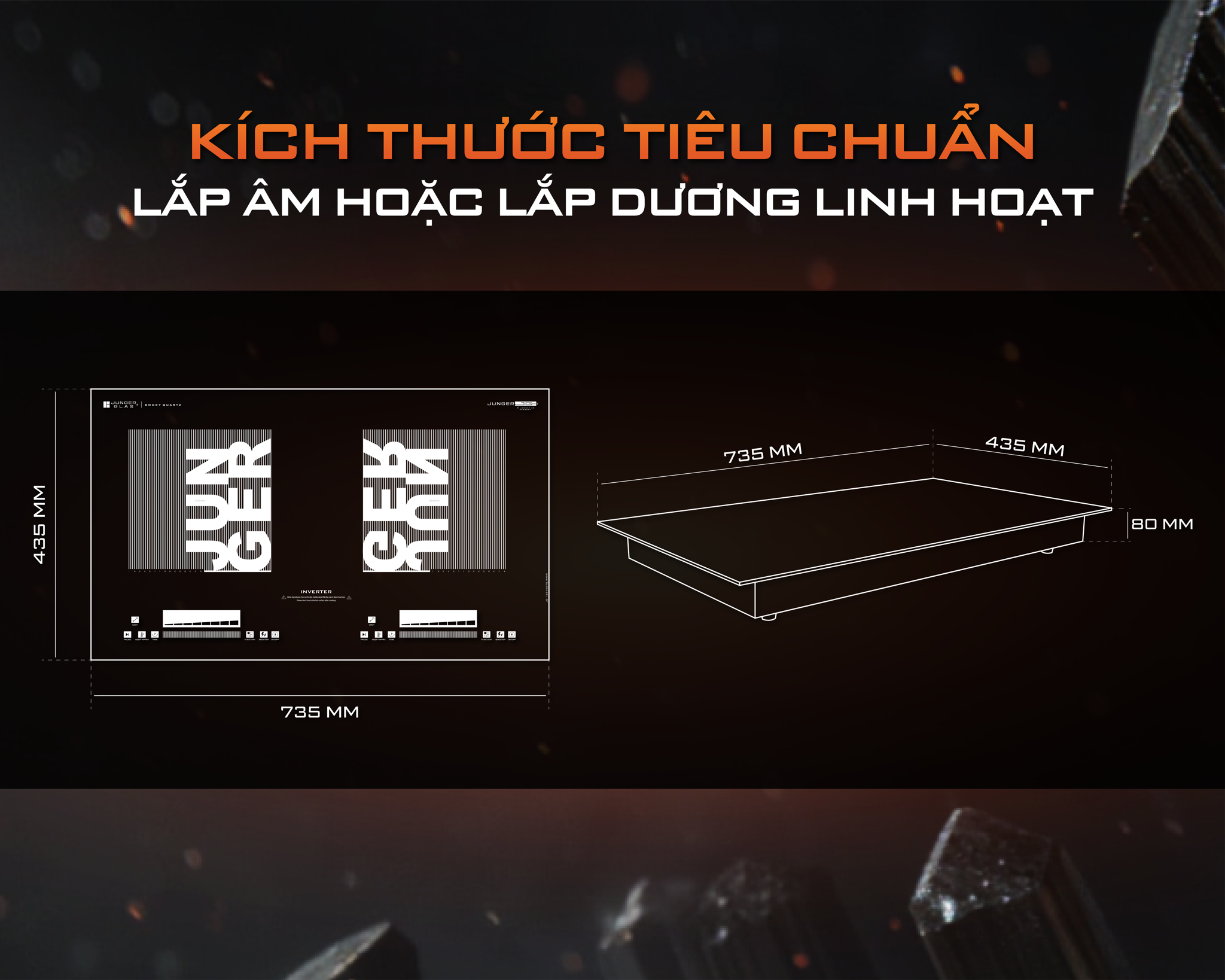 Với kích thước tiêu chuẩn, bếp từ đôi Junger JG cho phép lắp âm tạo mặt phẳng liền mạch hoặc lắp dương linh hoạt trong những không gian đã hoàn thiện. Dù ở hình thức nào, bếp vẫn giữ được độ ổn định, chắc chắn và toát lên khí chất đẳng cấp đặc trưng của Junger JG.