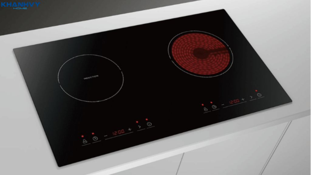 Kết hợp bếp hồng ngoại và bếp điện từ: Bếp được thiết kế thông minh với 1 vùng nấu từ - chỉ có thể sử dụng với đáy nhiễm từ và một cùng hồng ngoại - có thể sử dụng nhiều loại nồi và chảo, thậm chí có thể nướng trực tiếp trên mặt bếp.