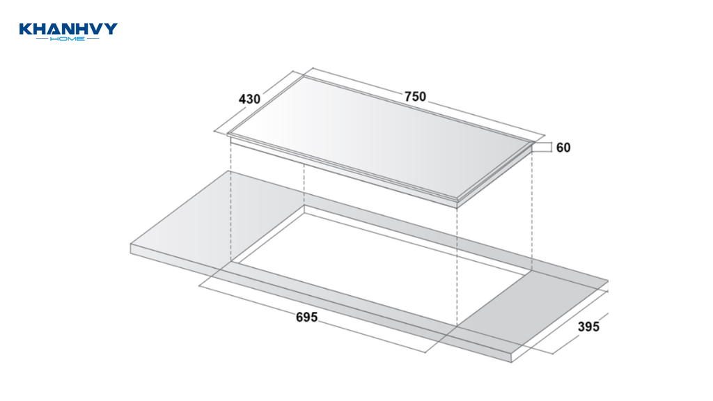 Bước 1: Chuẩn bị vị trí lắp đặt, đo kích thước khoét lỗ trên mặt bếp theo kích thước chuẩn của bếp: 695 x 395 mm. Đảm bảo vị trí lắp đặt cách xa các vật liệu dễ cháy và có không gian thoáng để tản nhiệt tốt.