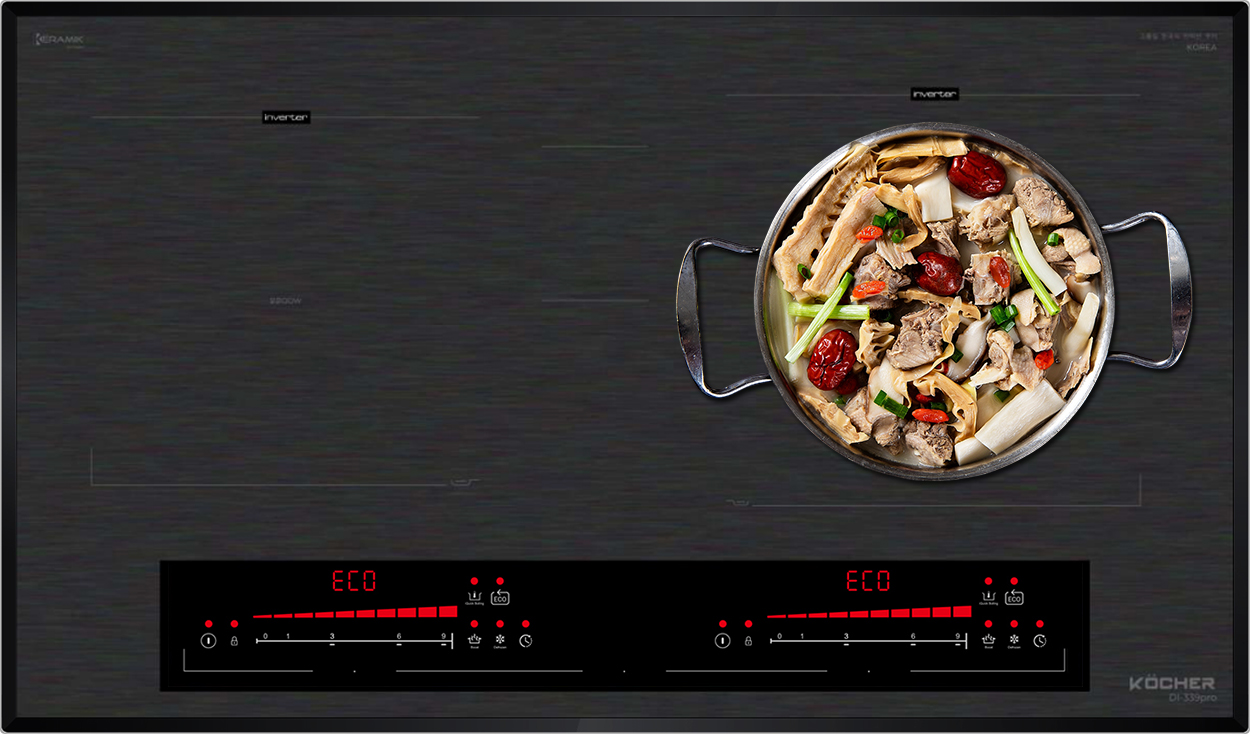 Bếp từ Kocher DI-339Pro là một trong những bếp từ đôi ĐẦU TIÊN trên thị trường Việt Nam tích hợp công nghệ Inverter trên 2 vùng nấu. Bếp được trang bị 2 vùng nấu điều khiển độc lập công suất không san tải.