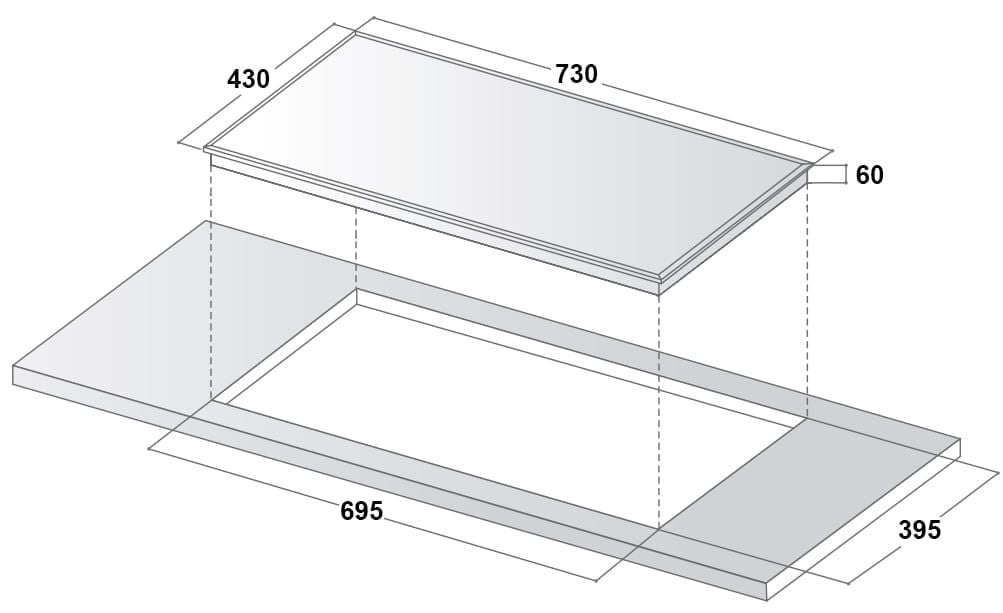 - Kích thước khoét lỗ: R695 x S395 (mm)