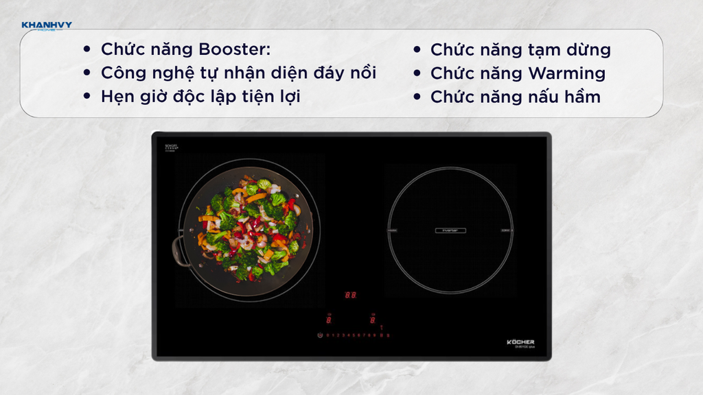 Chức năng Booster: Khi cần đun sôi hoặc nấu nhanh, người dùng có thể kích hoạt chế độ Booster để bếp hoạt động ở mức công suất tối đa lên đến 3400W mỗi bên, giúp rút ngắn đáng kể thời gian chế biến mà vẫn đảm bảo hiệu quả nấu nướng.