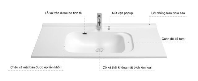 Thiết kế liền khối này giúp loại bỏ các mối nối thông thường giữa mặt đá và chậu rửa, đảm bảo sản phẩm không rò rỉ nước, không nấm mốc, vi khuẩn và vết bẩn bám vào vị trí mối nối silicon sau một thời gian sử dụng. Bên cạnh đó thiết kế tích hợp này giúp giảm chi phí thi công, cắt ghép lỗ chậu tại công trình và dễ quản lý chất lượng thi công đồng nhất.