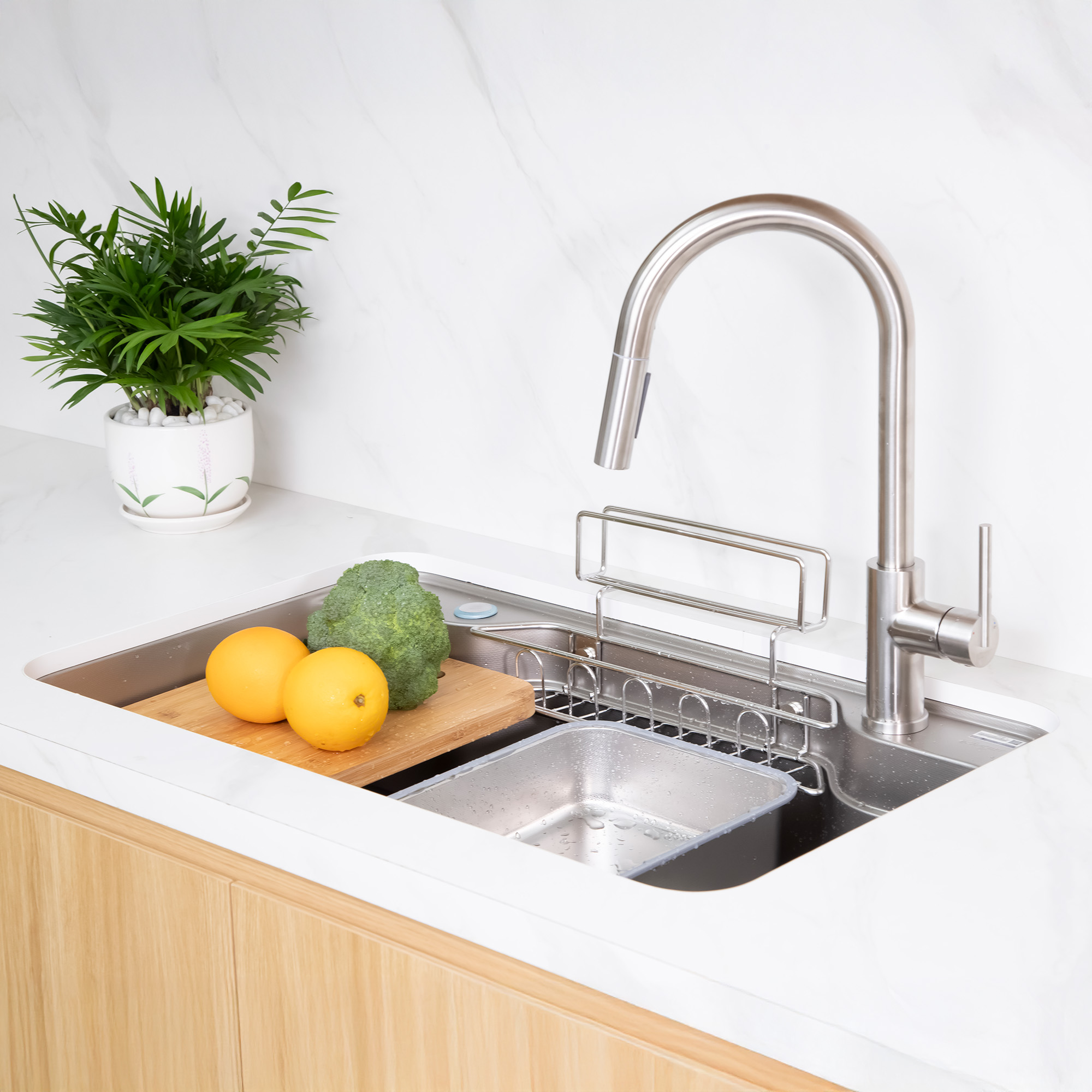 Giỏ đựng đồ inox 304 thiết kế phù hợp với kích thước và hình dạng của chậu, là một giải pháp thông minh để tận dụng không gian trong chậu và giữ cho đồ dùng như bàn chải, xà phòng và thớt gỗ được sắp xếp gọn gàng và tiện lợi.