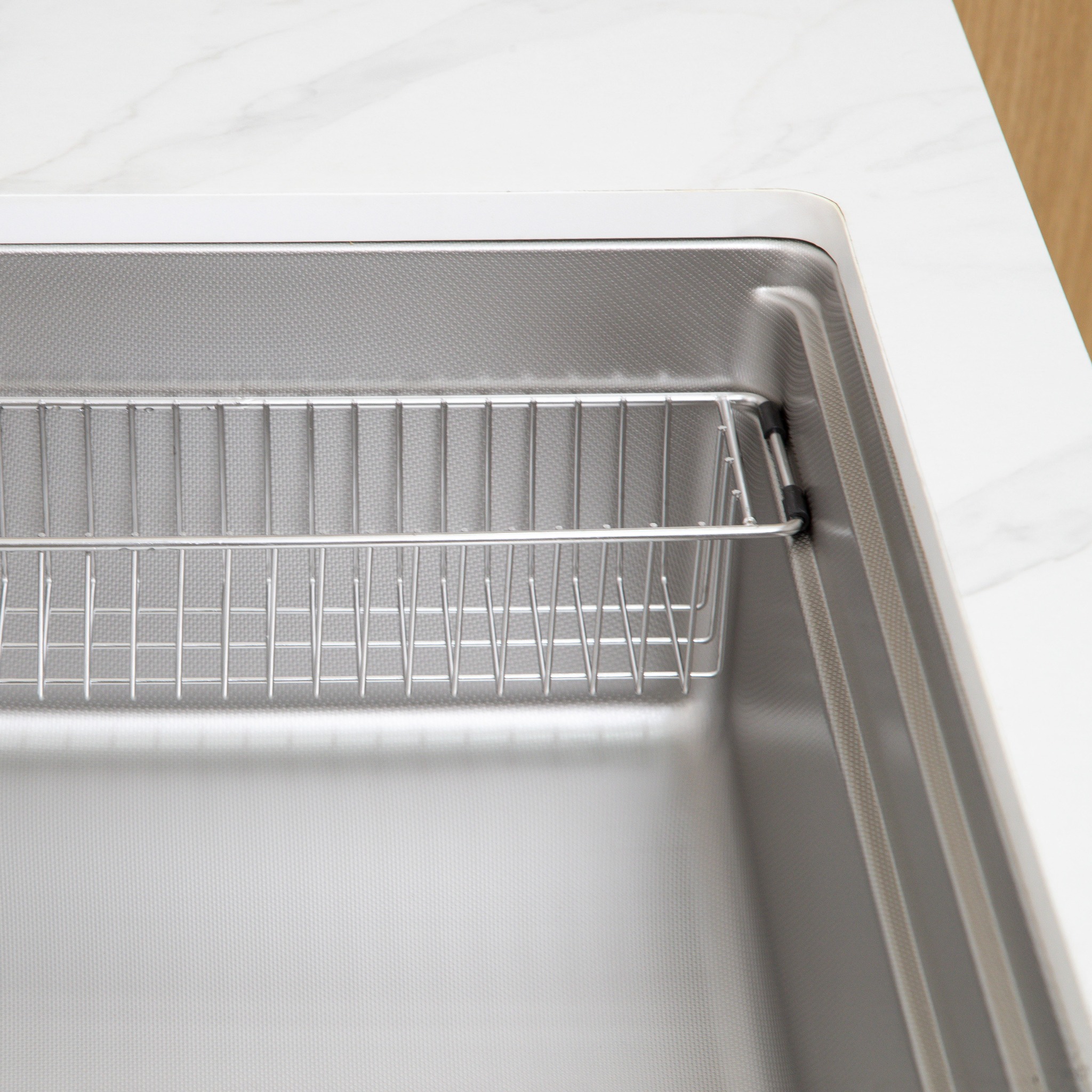 Giỏ đựng đồ bằng inox 304 cao cấp được thiết kế vừa vặn với kích thước chậu, mang đến giải pháp thông minh để tận dụng tối đa không gian. Nhờ đó, các vật dụng như bàn chải, xà phòng hay thớt được sắp xếp gọn gàng, sạch sẽ và tiện lợi, giúp căn bếp luôn ngăn nắp và hiện đại.