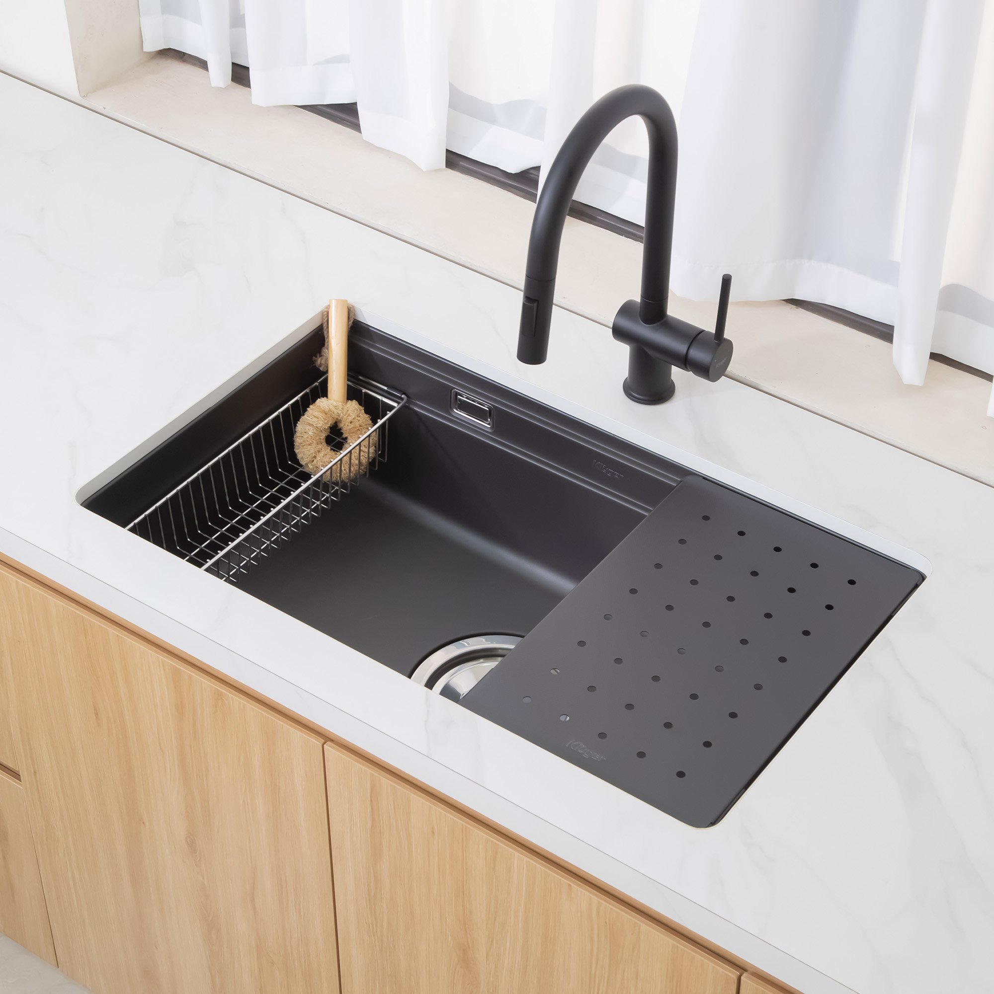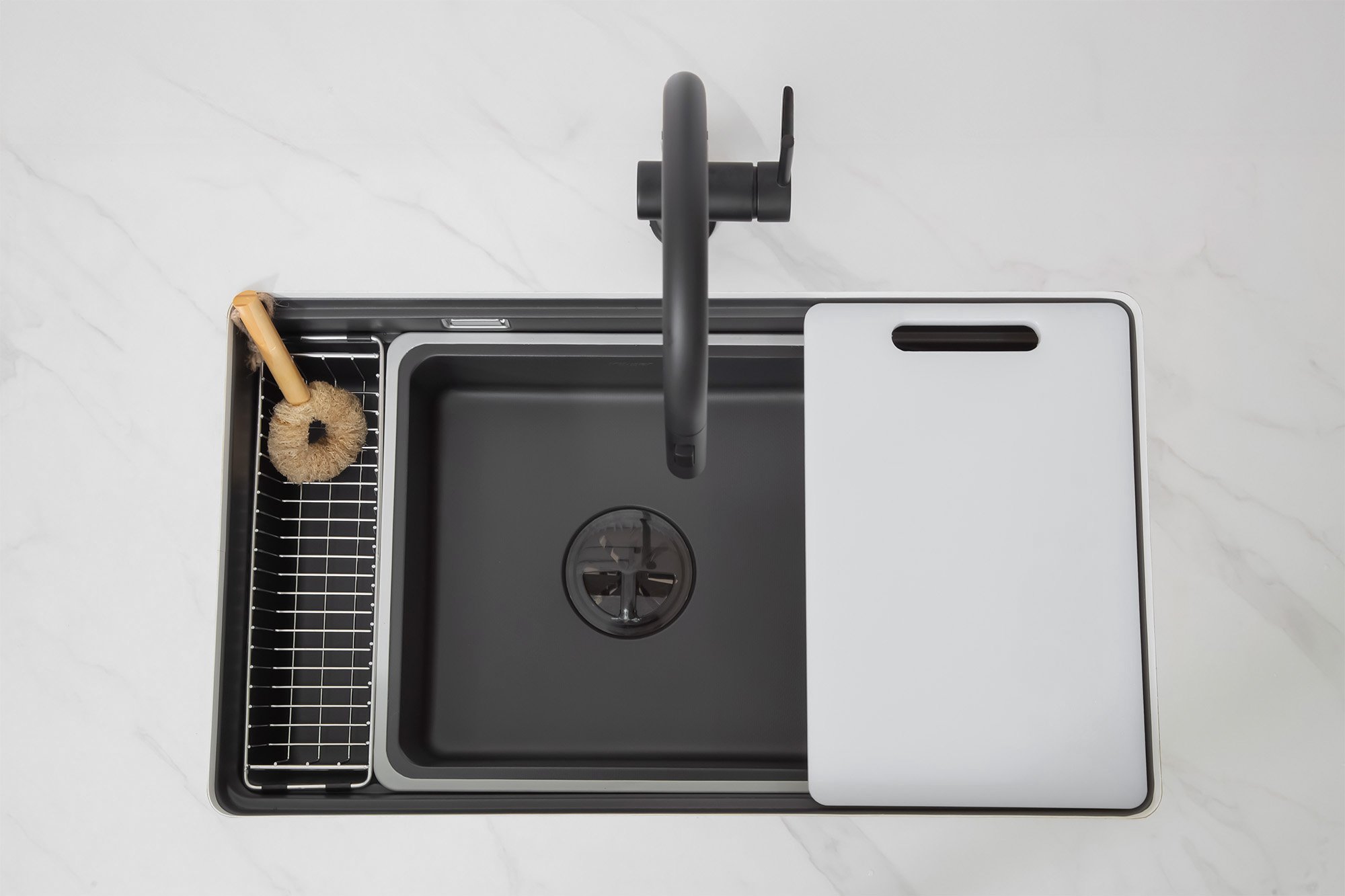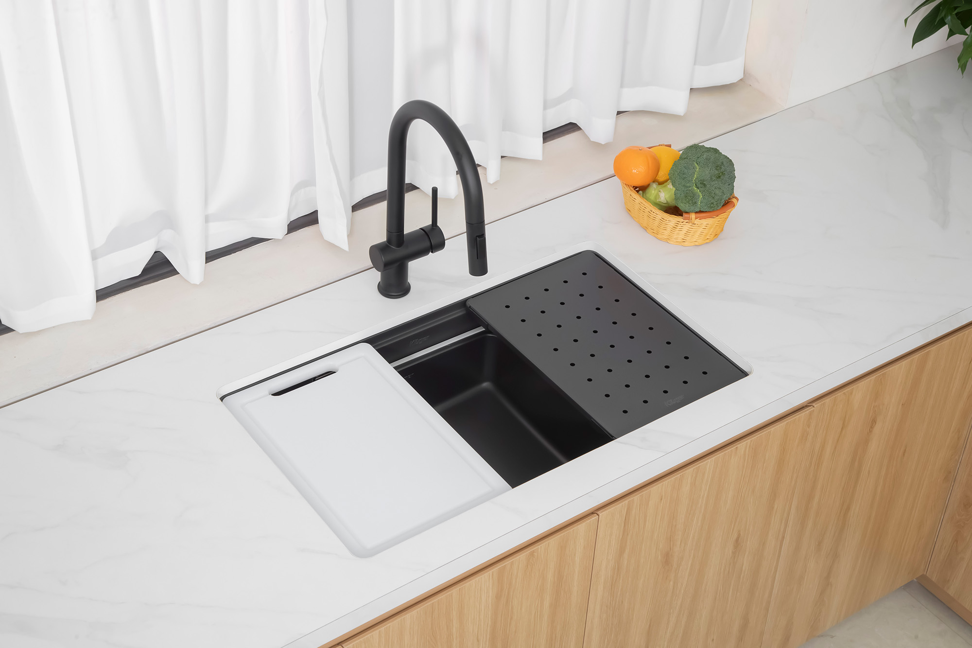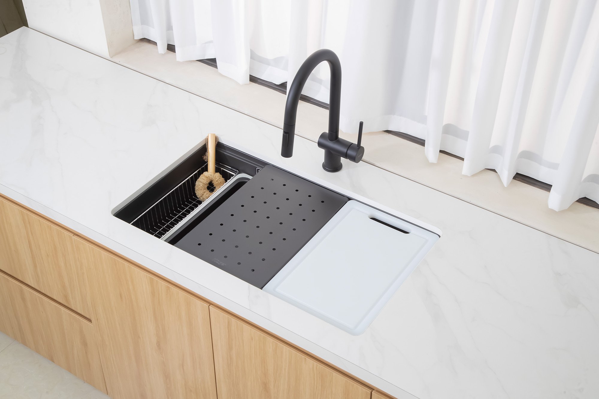 Thiết kế đường ray để tích hợp nhiều phụ kiện đồng bộ như giỏ đựng inox 304, thớt nhựa cao cấp, rổ lọc hay khay úp đồ. Sự kết hợp này mang đến giải pháp đa chức năng, giúp người dùng dễ dàng sơ chế, rửa và sắp xếp gọn gàng ngay trong cùng một không gian.