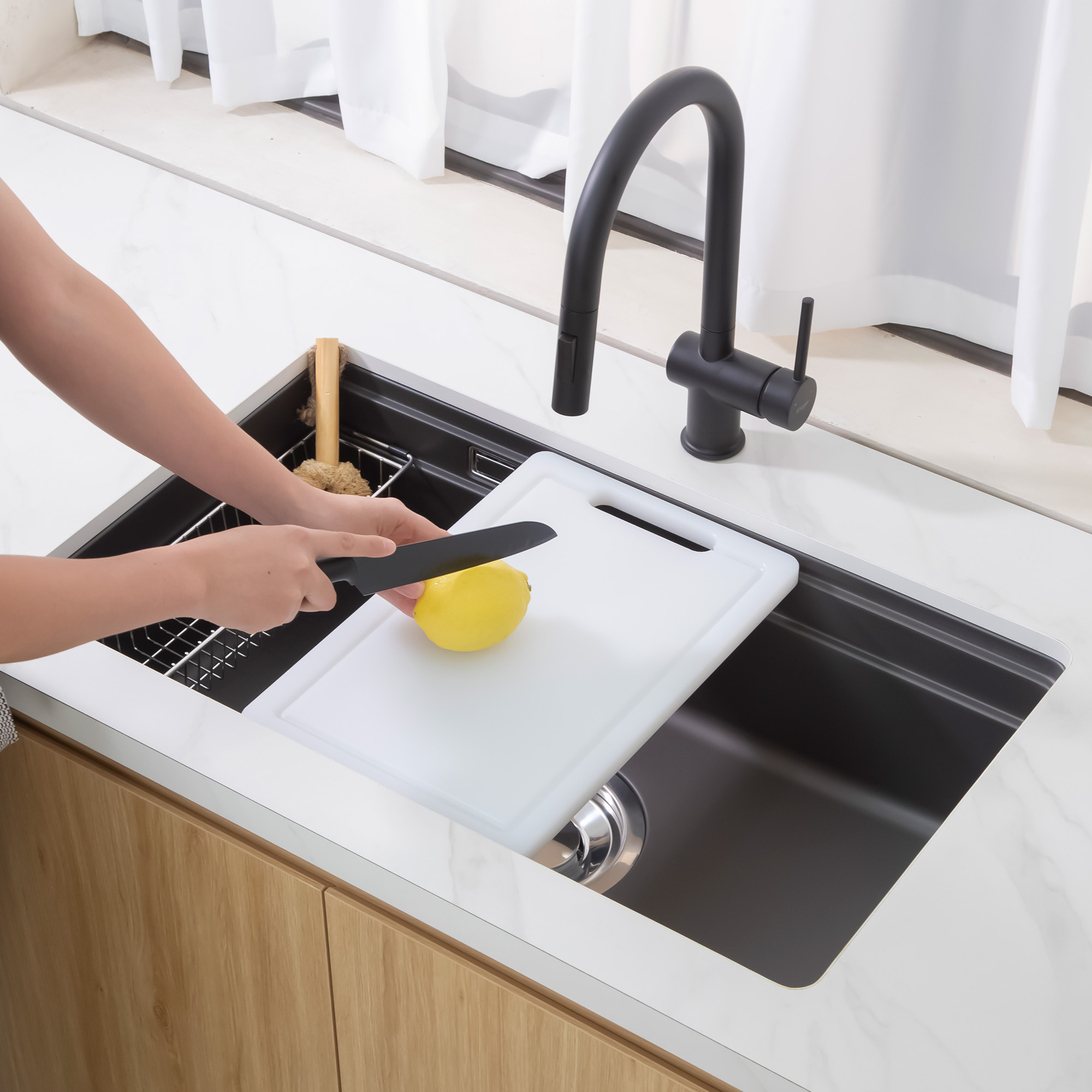 Giỏ đựng đồ bằng inox 304 cao cấp được thiết kế vừa vặn với kích thước chậu, mang đến giải pháp thông minh để tận dụng tối đa không gian. Nhờ đó, các vật dụng như bàn chải, xà phòng hay thớt được sắp xếp gọn gàng, sạch sẽ và tiện lợi, giúp căn bếp luôn ngăn nắp và hiện đại.