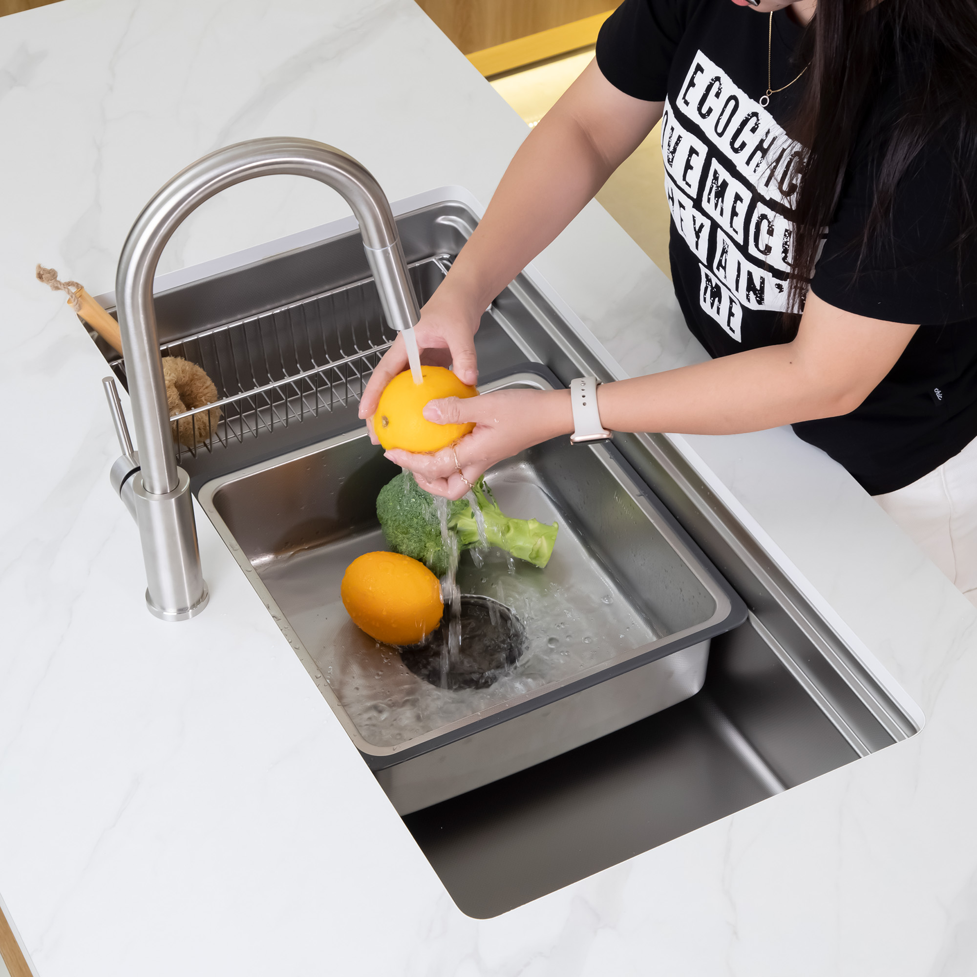 Giỏ đựng đồ bằng inox 304 cao cấp được thiết kế vừa vặn với kích thước chậu, mang đến giải pháp thông minh để tận dụng tối đa không gian. Nhờ đó, các vật dụng như bàn chải, xà phòng hay thớt được sắp xếp gọn gàng, sạch sẽ và tiện lợi, giúp căn bếp luôn ngăn nắp và hiện đại.
