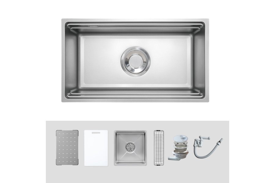 Thiết kế đường ray để tích hợp nhiều phụ kiện đồng bộ như giỏ đựng inox 304, thớt nhựa cao cấp, rổ lọc hay khay úp đồ. Sự kết hợp này mang đến giải pháp đa chức năng, giúp người dùng dễ dàng sơ chế, rửa và sắp xếp gọn gàng ngay trong cùng một không gian.