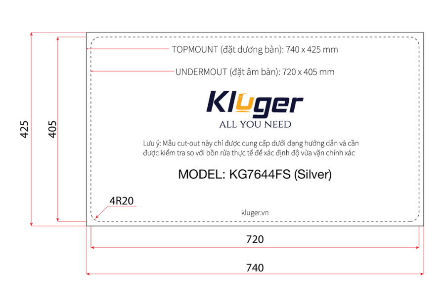 | Kích thước cắt đá | Lắp dương: D740 x R425 mm Lắp âm: D720 x R405 mm |