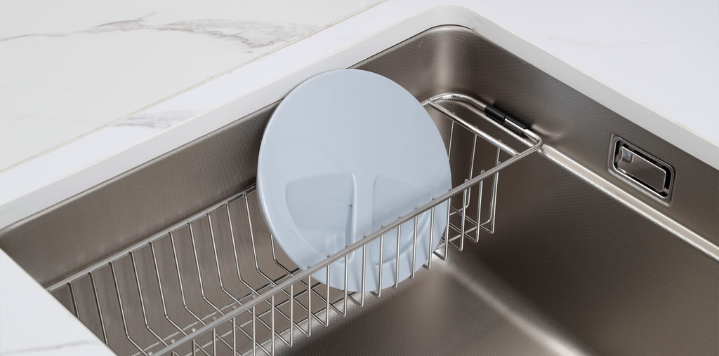 Chậu bếp sẽ luôn khô ráo và dễ dàng làm sạch, ngăn ngừa tích tụ nước và vi khuẩn nhờ thiết kế đáy chậu nghiêng 1 góc 3-4 độ kết hợp cùng bát rác kích thước lớn 185mm.