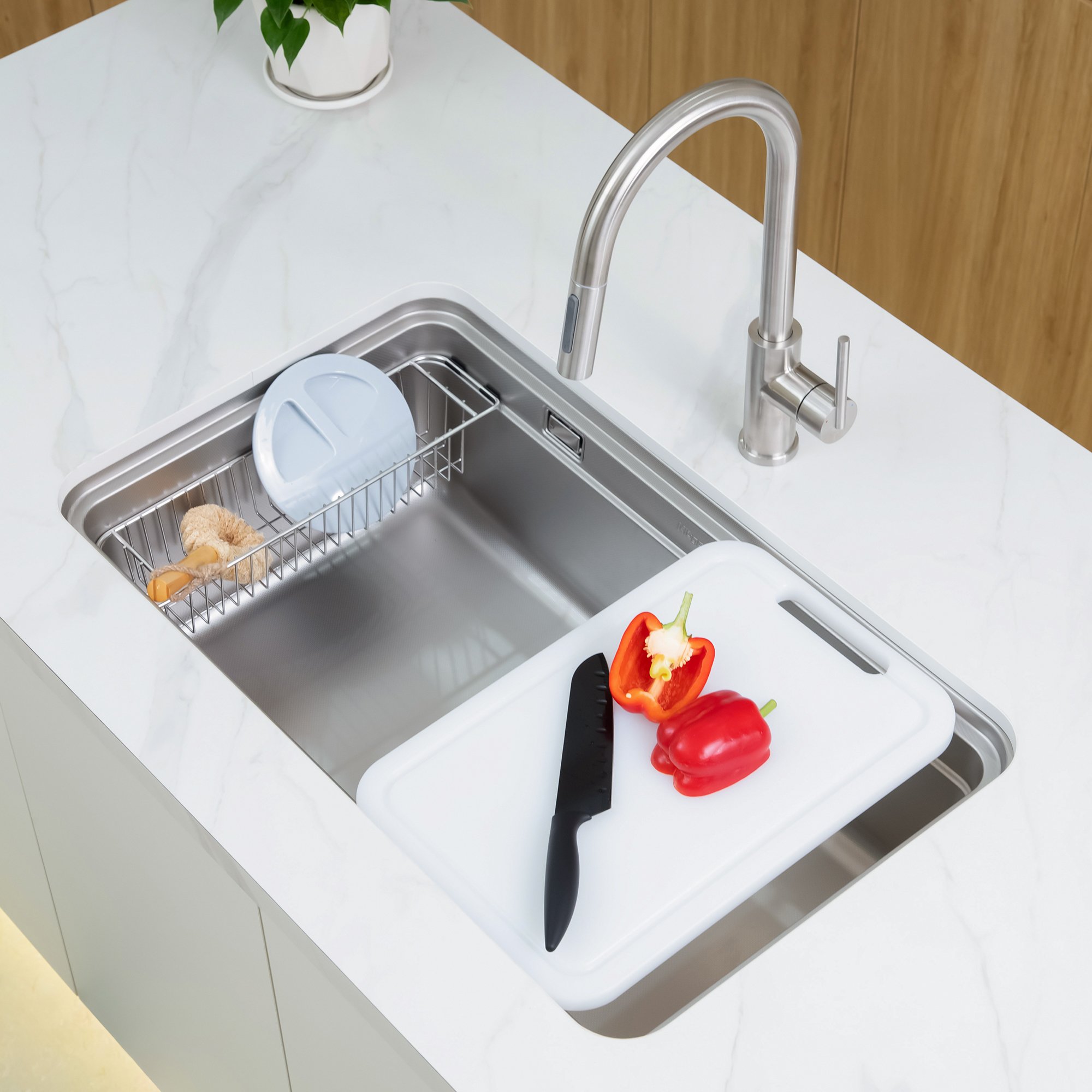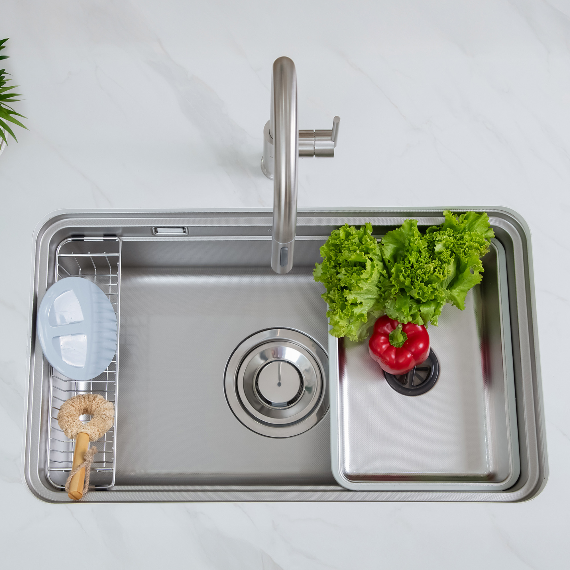 Giỏ đựng đồ inox 304 thiết kế phù hợp với kích thước và hình dạng của chậu, là một giải pháp thông minh để tận dụng không gian trong chậu và giữ cho đồ dùng như bàn chải, xà phòng và thớt gỗ được sắp xếp gọn gàng và tiện lợi.
