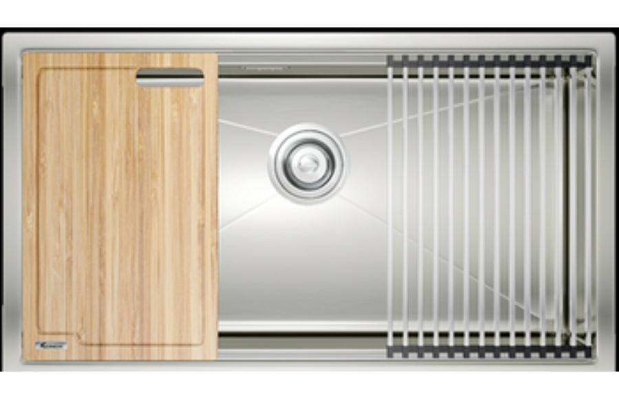 Dòng chậu hạ bậc, tích hợp công năng: Chậu được thiết kế với gờ hạ bậc, tích hợp sẵn thớt gỗ và rollmat, tối ưu không gian bếp và hỗ trợ tối đa cho việc sơ chế, dọn rửa.