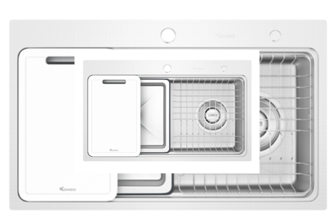 KN8048TS được thiết kế với 2 gờ hạ bậc thông minh, cho phép bạn trượt và kết hợp linh hoạt hệ thống phụ kiện đi kèm: Thớt nhựa, Chậu nhỏ (Colander), Rổ phụ và Giá úp bát. Bạn có thể thực hiện một quy trình làm bếp khép kín ngay tại chậu: rửa rau củ ở chậu nhỏ, thái trên thớt, và úp ráo trên giá mà không làm ướt bàn bếp, tối ưu hóa không gian và tiết kiệm thời gian một cách đáng kinh ngạc.