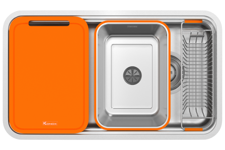 - Tích hợp phụ kiện đáp ứng đủ tiêu chí sử dụng hàng ngày của người nội trợ: thớt nhựa cam, colander và rổ phụ.
