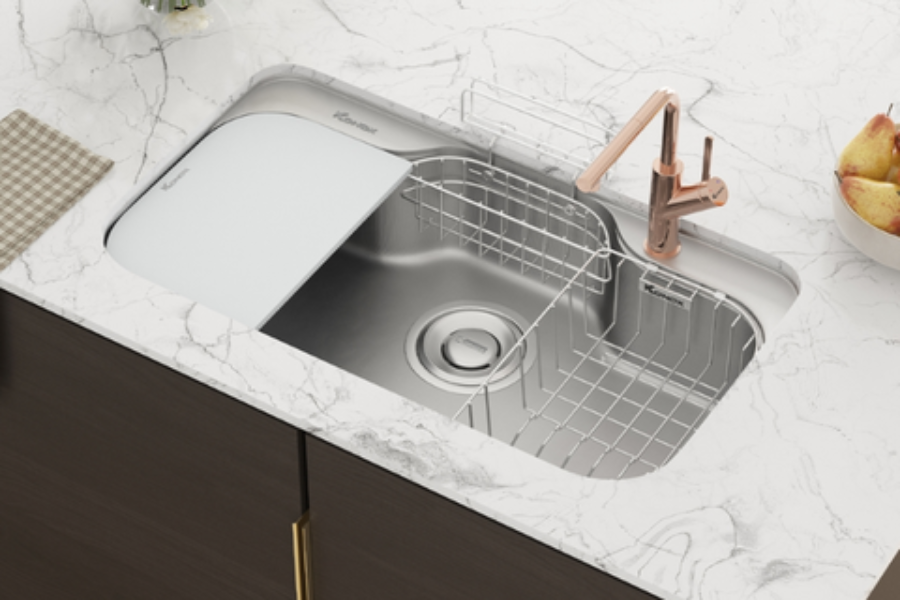 Thiết kế workstation thông minh với gờ hạ bậc tiện dụng, cho phép tích hợp phụ kiện gồm thớt nhựa, rổ phụ, giá úp bát inox và bộ xả Siphon – giúp tiết kiệm thời gian thao tác và mở rộng không gian sử dụng trên bồn rửa.