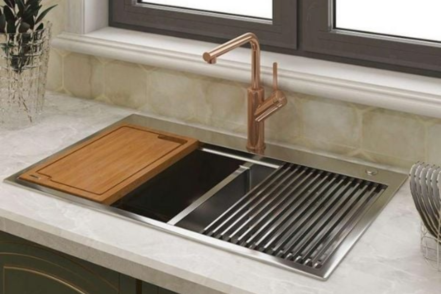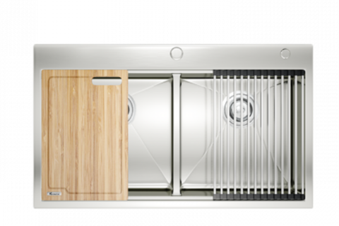Thiết kế Workstation: Chậu rửa bát Konox KN8850TD thuộc dòng chậu Workstation, được thiết kế thông minh với gờ hạ bậc và tích hợp phụ kiện, mang đến trải nghiệm tuyệt vời trong thao tác làm bếp.